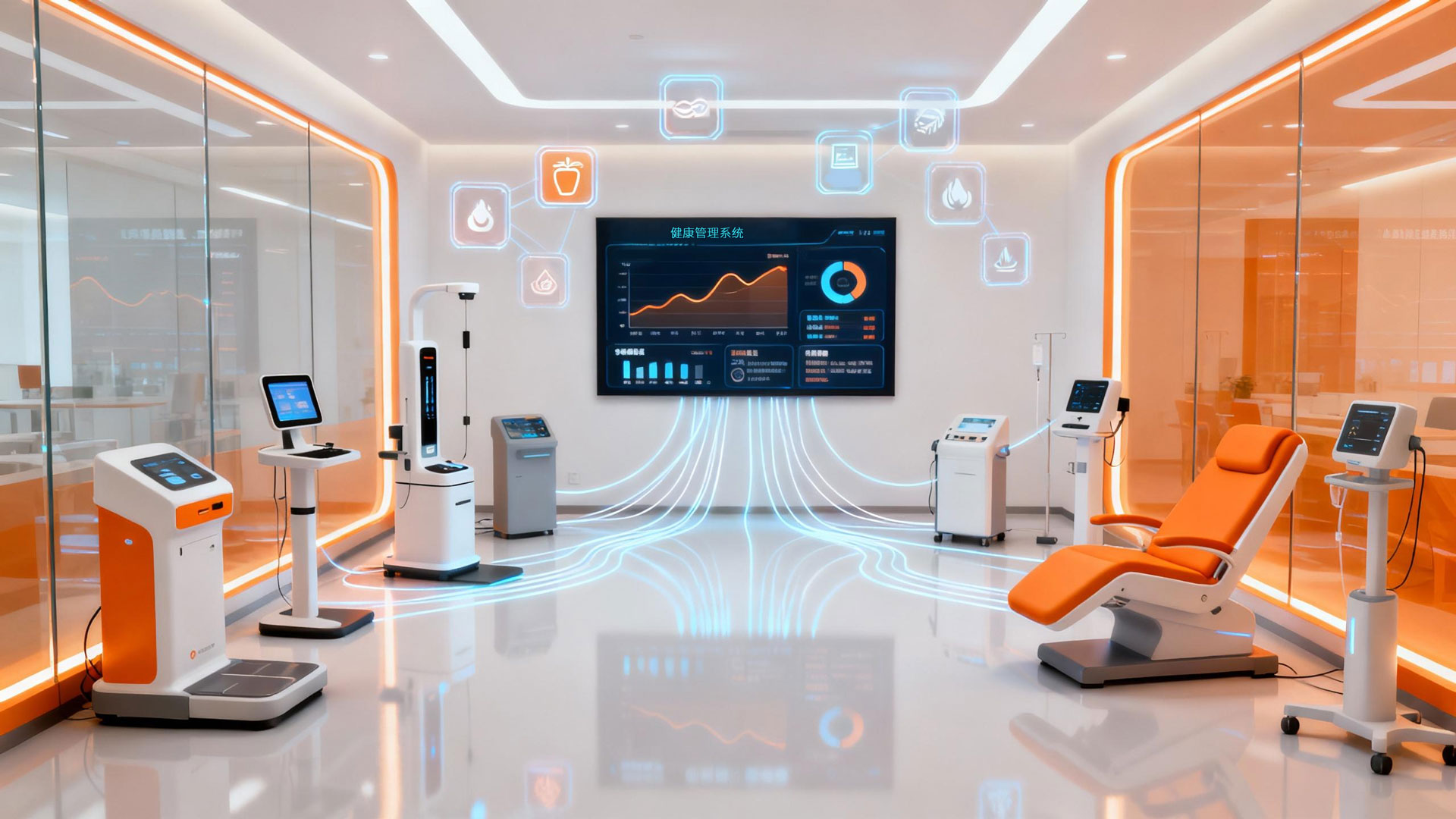 - 多功能健康管理一体机(集成测量身高、体重、BMI、血压、血氧、体温、人体成分、骨骼肌、血糖、尿酸、胆固醇、心电、血脂四项等);