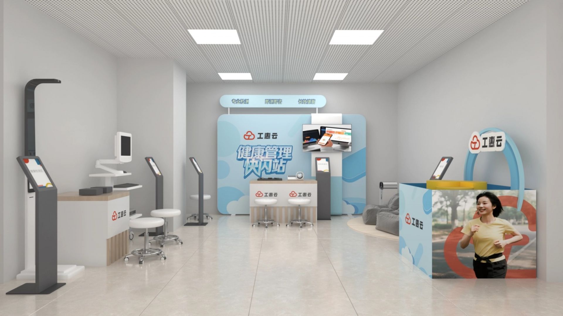 面对这一复杂课题,工惠云提出了一个简单而有效的解决方案:健康快闪站。