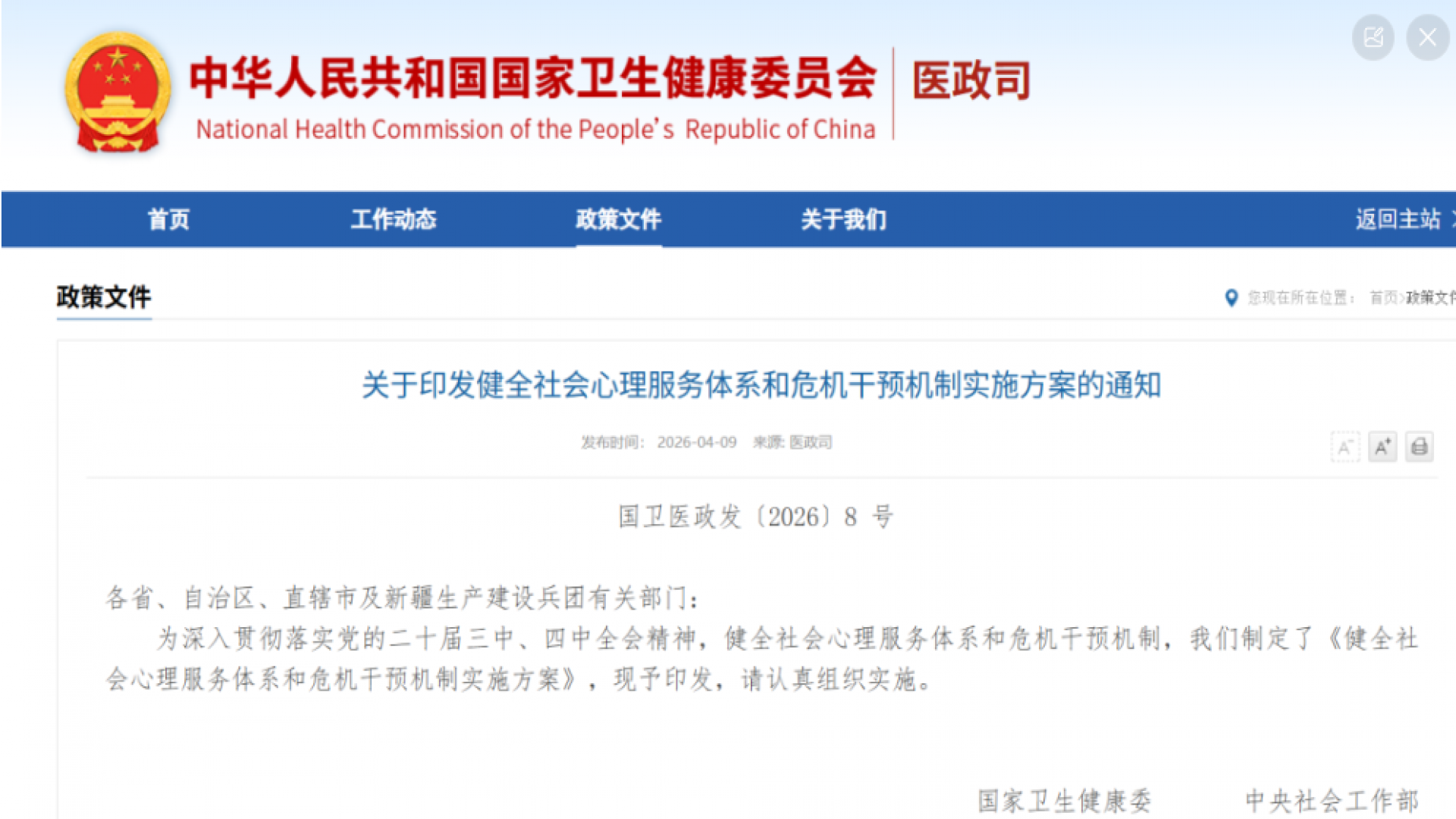 2026年4月9日,国家卫健委等25部门联合印发《健全社会心理服务体系和危机干预机制实施方案》(国卫医政发〔2026〕8号),明确要求:各级党政机关、企事业单位必须创造条件为员工提供心理服务,鼓励设立心理辅导室,引入生理心理客观检测设备,建立“筛查-预警-干预”全链条机制。